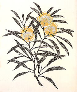 Haloed Australian botanical specimens become sainted icons against an English garden backdrop.